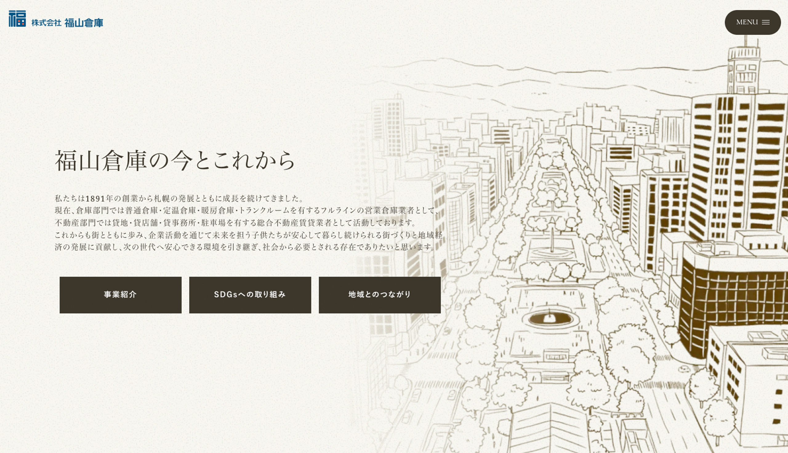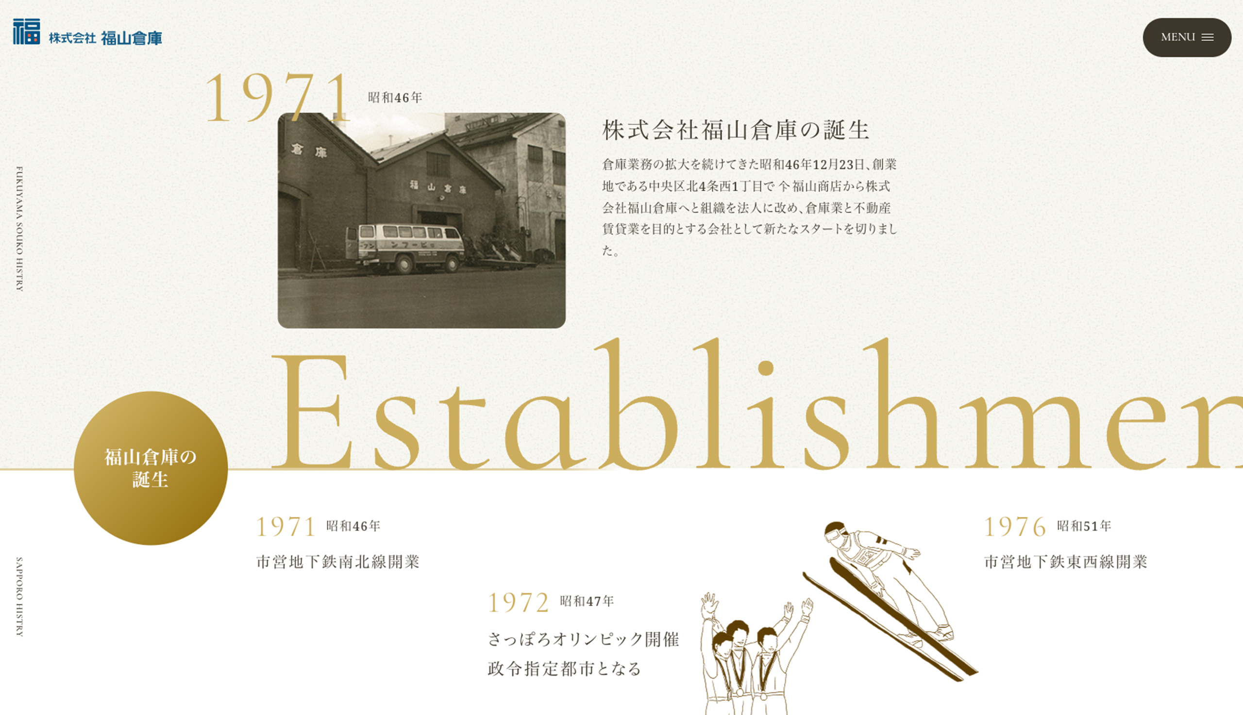 明治24年創業の長い歴史を持ち、札幌で倉庫業・不動産賃貸業を営まれている株式会社福山倉庫さまの歴史を紹介するページをリニューアルしました。 札幌という街の発展とともに歩んできたことを訴求するため、自社の沿革の他に、札幌の沿革もあわせて紹介する構成にいたしました。 また、横スクロールや背景に紙のようなざらっとしたテクスチャーを敷くことにより、歴史をひもといた書物を読み進めるような印象を与える工夫を盛り込みました。