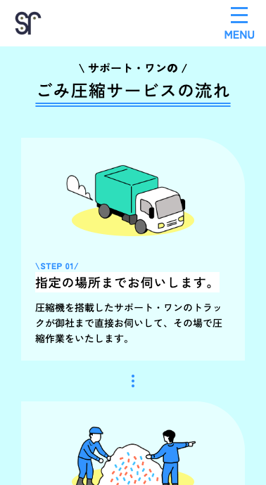 北海道・札幌を拠点に、事業系一般廃棄物の圧縮サービスを展開されている有限会社サポート・ワン様のWebサイトリニューアルを担当しました。サービス内容や導入メリットがより伝わりやすく、はじめてサイトを訪れた方にも親しみを持ってもらえるサイトを目指して、構成・デザイン・表現設計を見直しました。